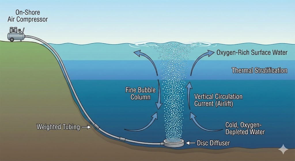 10 ফুটের বেশি গভীর হ্রদে, একই পরিমাণ জল সরানোর জন্য একটি পৃষ্ঠের বায়ুচালককে দ্বিগুণ কঠোর পরিশ্রম করতে হবে। একটি সাবসারফেস ডিফিউজার এর প্রাকৃতিক পদার্থবিদ্যা ব্যবহার করে উচ্ছ্বাস এবং গ্যাস স্থানান্তর . বুদবুদ বাড়ার সাথে সাথে, তারা প্রসারিত হয়, পৃষ্ঠের ক্ষেত্রফল এবং শূন্য অতিরিক্ত শক্তি খরচে উল্লম্ব স্রোতের "টান" বাড়ায়।