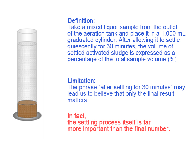 | নিষ্পত্তির গতি | প্রাথমিক ফ্লোকুলেশন গতি এবং বিনামূল্যে এবং ফ্লোকুলেন্ট নিষ্পত্তির হার; যে গতিতে স্লাজ-ওয়াটার ইন্টারফেস তৈরি হয়। | 1. সক্রিয় স্লাজ কার্যকলাপ (উচ্চতর = দ্রুত); 2. স্লাজ বার্ধক্য (বয়স্ক = ধীর); 3. স্লাজ বিষাক্ততা (বিষাক্ত = ধীর); 4. স্লাজ সান্দ্রতা (উচ্চতর = ধীর); 5. ফিলামেন্টাস বাল্কিং (সামগ্রিক ধীর); 6. স্লাজ ঘনত্ব (প্রাথমিক ফ্লোকুলেন্ট সেটলিং); 7. স্থগিত কঠিন উপাদান (উচ্চতর = ধীর); 8. জল তাপমাত্রা এবং সান্দ্রতা. |