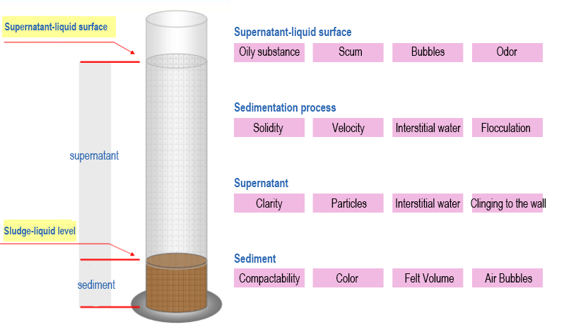 | সুপারনেট্যান্ট পৃষ্ঠ - গন্ধ | গন্ধ নির্গত (প্রাথমিক নিষ্পত্তির সময়) | 1. শক্ত মাটির গন্ধ উচ্চ জৈবিক কার্যকলাপ নির্দেশ করে 2. শক্তিশালী অম্লীয় বা ক্ষারীয় গন্ধ অস্বাভাবিক মিশ্রিত মদের pH নির্দেশ করে 3. তীব্র দুর্গন্ধ অক্সিজেনের ঘাটতির পরামর্শ দেয় 4. অন্যান্য অস্বাভাবিক গন্ধ নির্দিষ্ট শিল্প বর্জ্য জলের প্রবাহ নির্দেশ করতে পারে। |