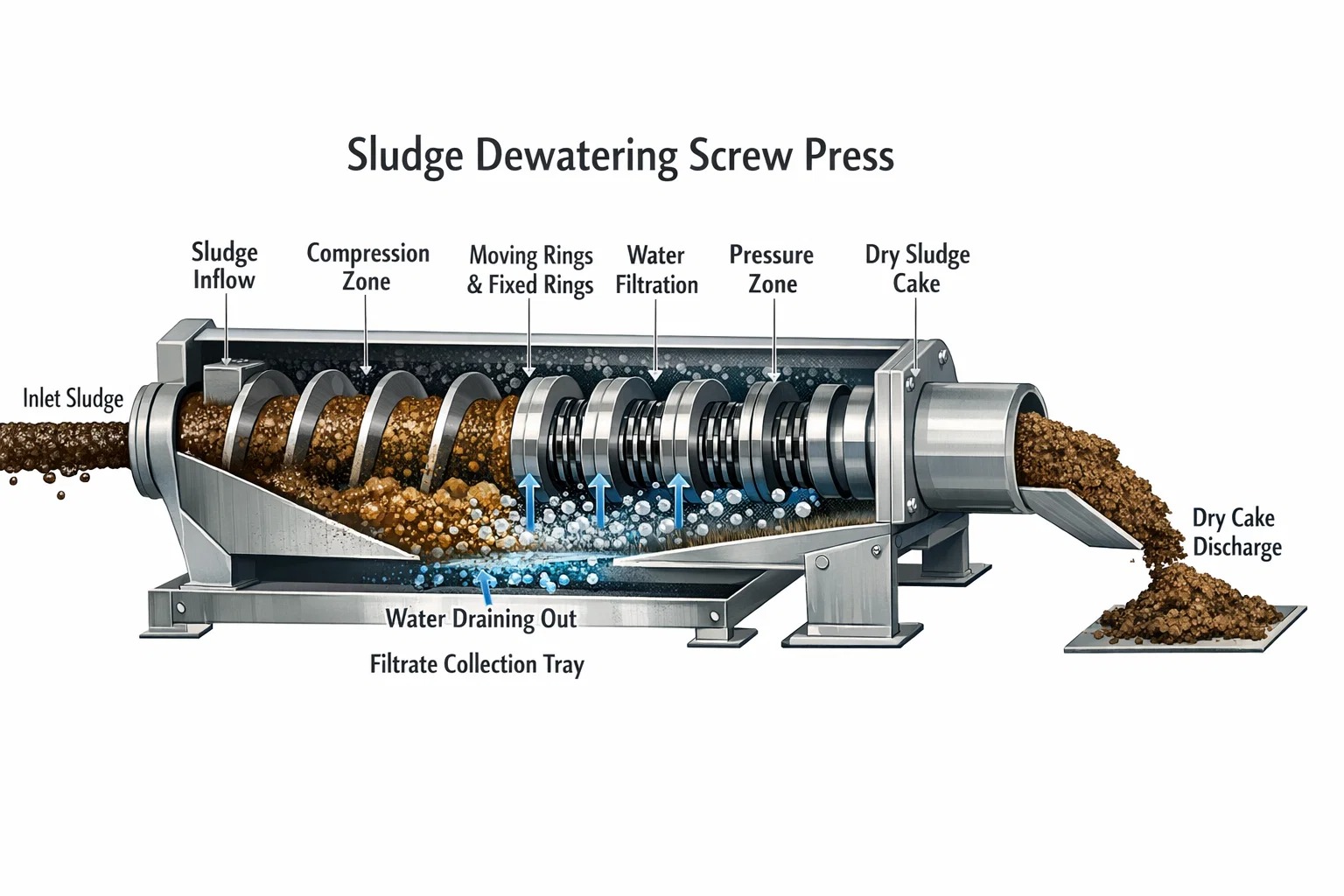 - ইন্টিগ্রেশন: A স্লাজ ডিওয়াটারিং স্ক্রু প্রেস হয় the perfect partner for MBR. It handles the high-concentration waste sludge efficiently, turning it into a dry “cake” for easy disposal. Its low-speed operation and self-cleaning mechanism mean it can handle the greasy, chemical-heavy sludge typical of these industries without clogging.