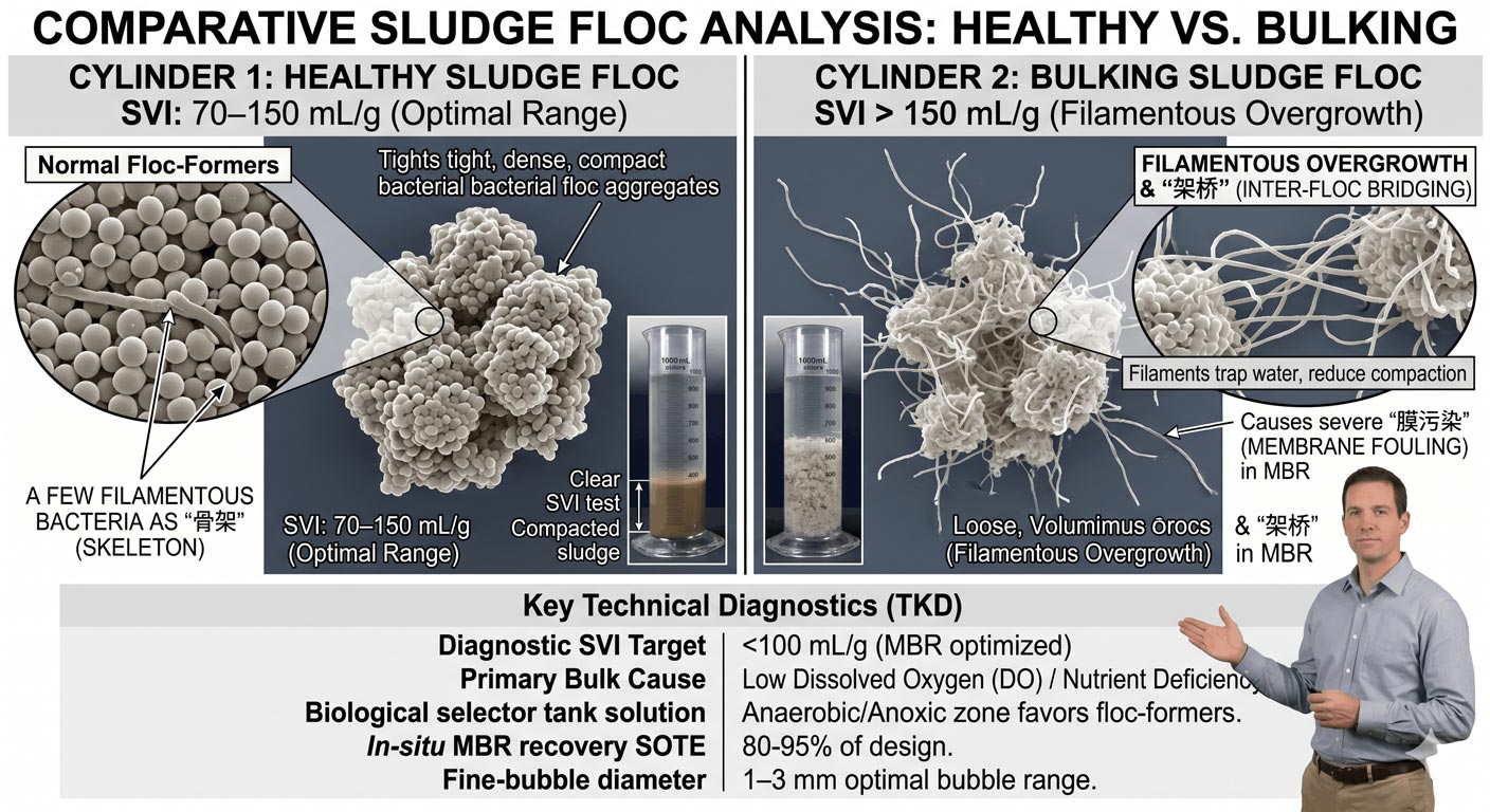 একটি উচ্চ SVI মানে প্রতিটি গ্রাম স্লাজ বেশি আয়তন দখল করে — স্লাজটি তুলতুলে, হালকা এবং আলাদা করা কঠিন। ফলাফল: সেকেন্ডারি ক্ল্যারিফায়ার কর্মক্ষমতা ধসে পড়ে, টিএসএসের বর্জ্য বৃদ্ধি পায় এবং জৈবিক চিকিত্সার দক্ষতা কমে যায়।