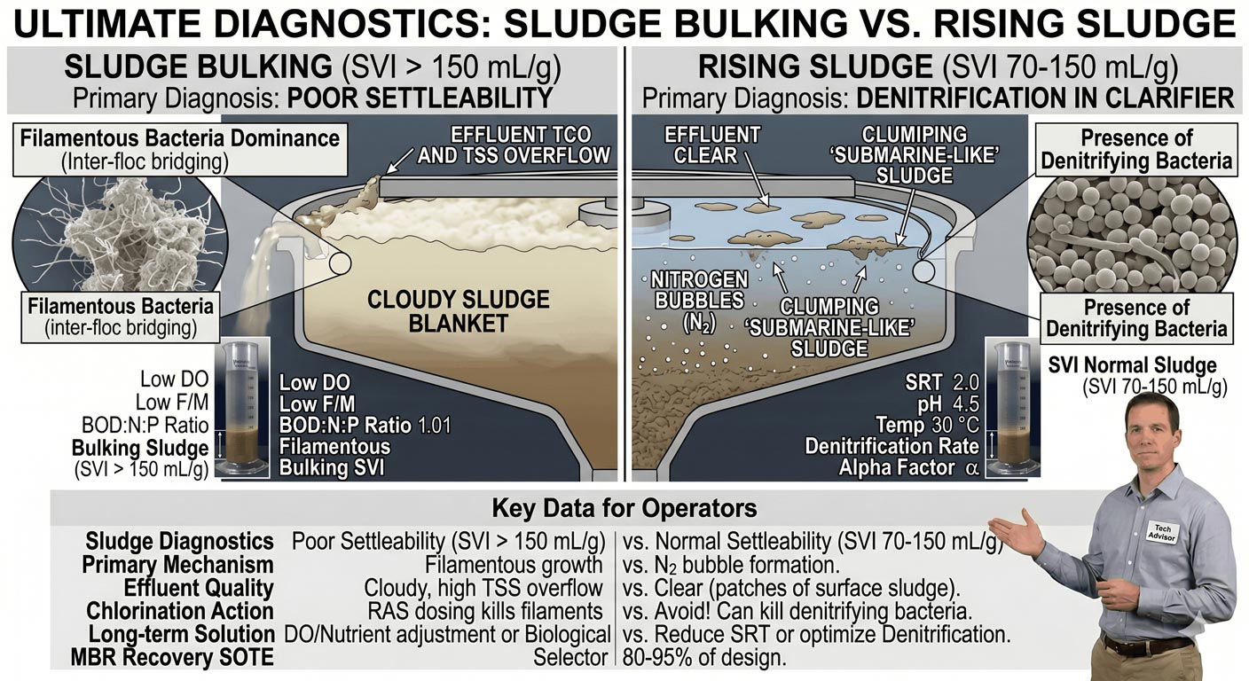 | প্রধান কারণ | ফিলামেন্টাস ব্যাকটেরিয়া, কম ডিও, কম এফ/এম | ক্ল্যারিফায়ারে ডেনিট্রিফিকেশন (NO₃ অপর্যাপ্ত ডিও) |